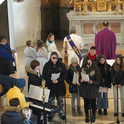Mit einem königlichen Einzug begann der Sternsingergottesdienst am Dreikönigstag. Diakon Michi Zepf zelebrierte die Wort-Gottes-Feier mit Kommunionspendung zum „Hochfest der Erscheinung des Herrn“. In vielen Texten und Liedern kam das Anliegen der Dreikönigsaktion zum Ausdruck. Noch einmal trat eine Sternsingergruppe auf und präsentierte ihre Botschaft. Die Segnung des Dreikönigswassers und des Salzes, das auch zum Mitnehmen angeboten wurde, bildete zusammen mit der Allerheiligenlitanei, vorgetragen von Martin Kirchberger, den feierlichen Abschluss der WGF.